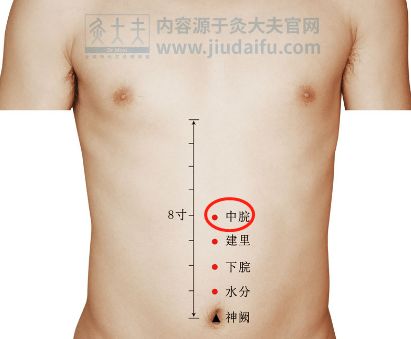 胸骨下端和肚脐连接线中点即为此穴。此穴主要管理消化系统疾病,如腹胀、腹泻、腹痛、腹鸣、吞酸、呕吐、便秘、黄疸等。经常食欲不振、目眩、耳鸣、慢性胃炎的人,可经常护理此穴位。