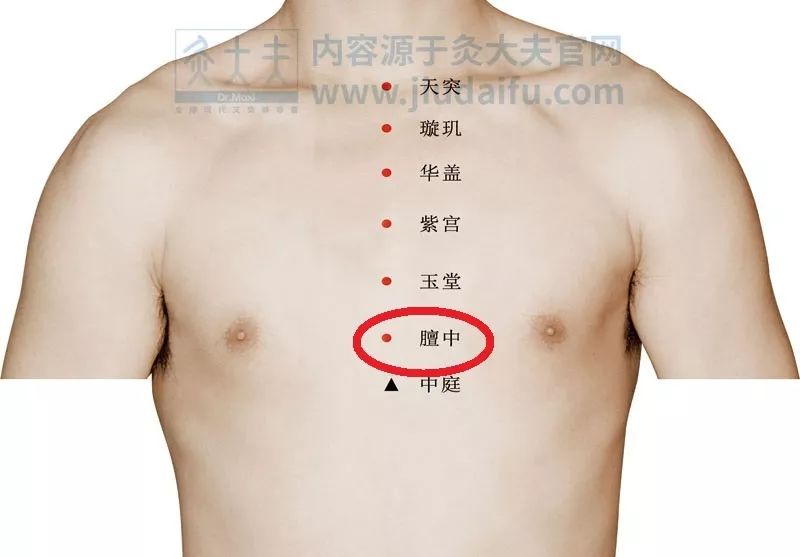 艾灸取穴:膻中穴、乳根穴、期门穴