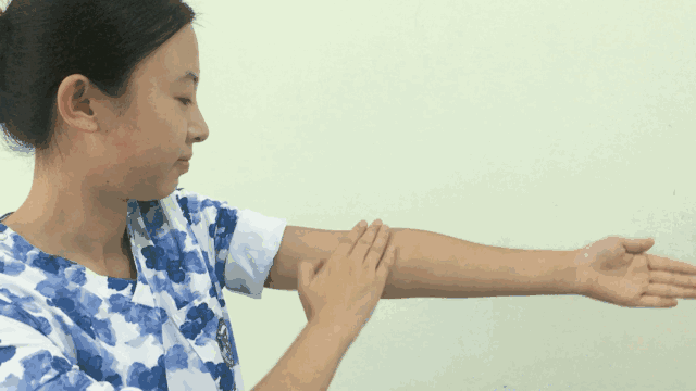 把左手臂伸直,用右手找到左手臂的肘横纹正中,用右手大拇指点住它定位,找到后,再用右手四指平放在肘窝正中,这个范畴之内都是拍打的区域。