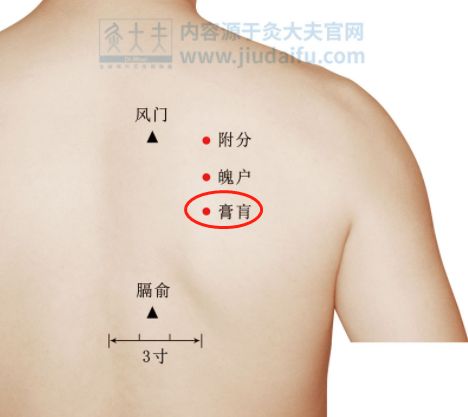 膏肓穴位于背部,当第四胸椎棘突下,左右旁开四指宽处(3寸)即是。膏,膏脂、油脂也;肓,心脏与膈膜之间也。古代医家将心尖的脂肪称为膏,心脏与隔膜之间称为肓。