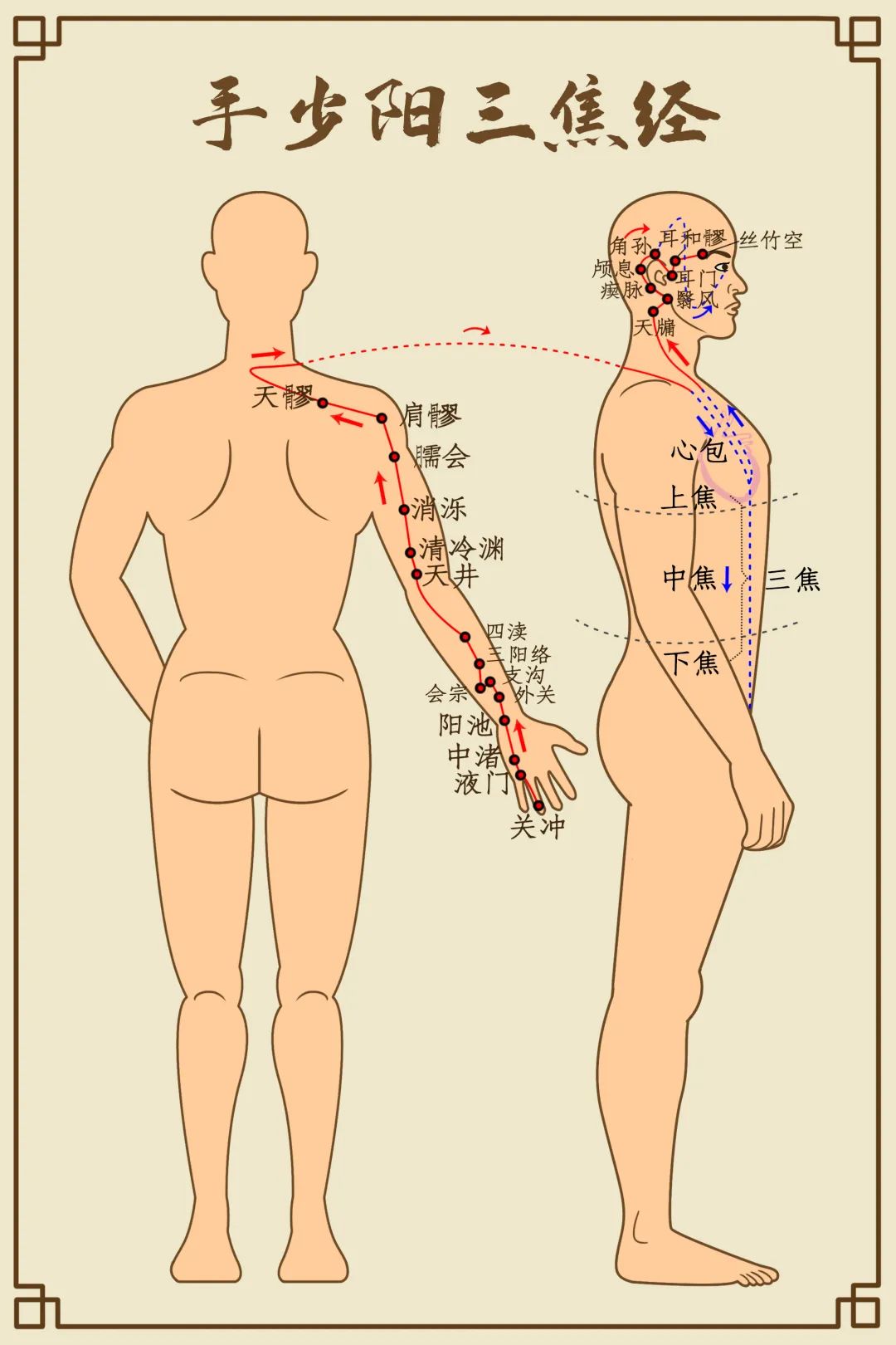 三焦经是人体的“出气筒”,在三焦经按摩或者刮痧,可有效调整内分泌失调,对调节长期情志病极为有效,对各种头面部疾病,以及更年期综合症都有特效。
