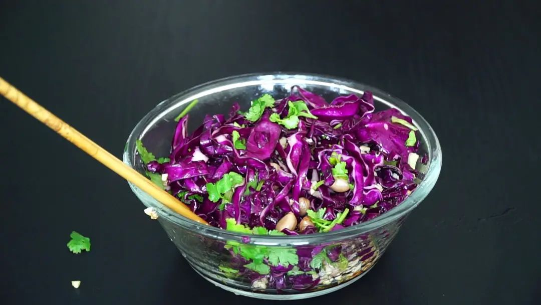 紫甘蓝、鸡粉、食盐、白芝麻、火麻油、盐、白糖、白醋、鸡精。