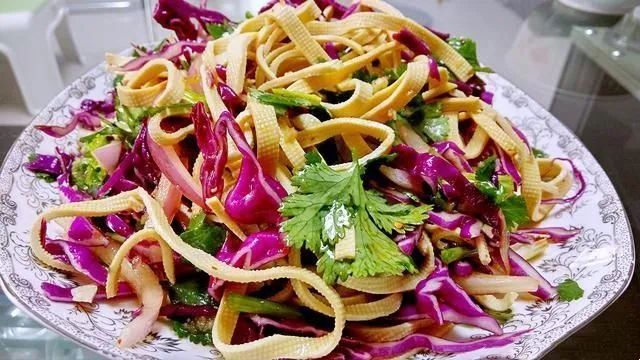 紫甘蓝100克、豆腐丝100克、香菜5根、白醋20ML、油10ML、生抽10ML、白糖5克、干辣椒3个、花椒10粒。