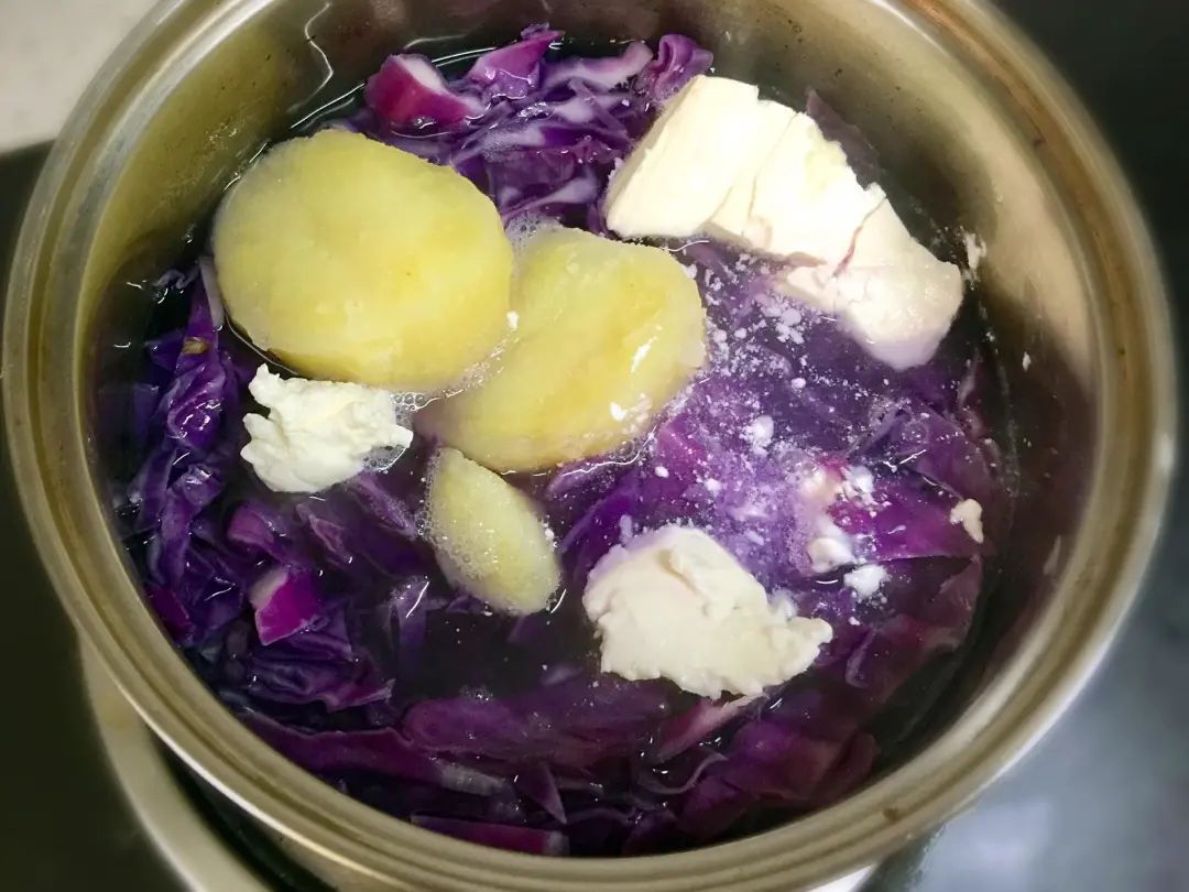 1.紫甘蓝洗净切丝,土豆去皮切小块,土豆放入加了足量水的锅中煮至软熟(约15分钟),然后放入紫甘蓝同煮3分钟至紫甘蓝熟透。