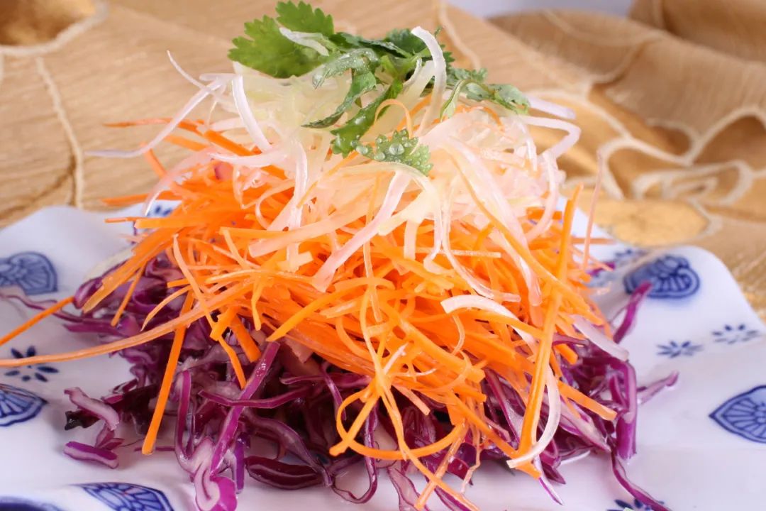 1.紫甘蓝洗净,切丝,加入适当盐和糖腌制一会儿,把多余的水分倒掉;